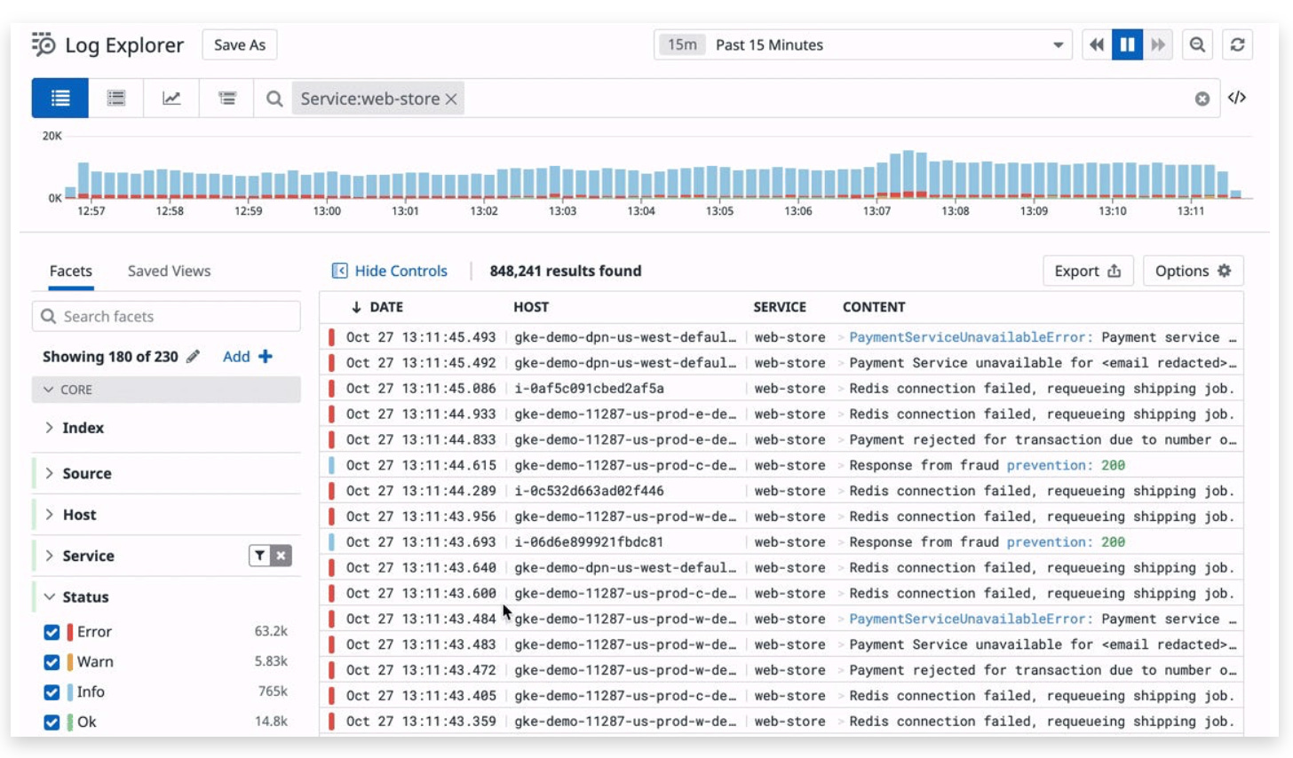 When configured correctly, Datadog will be able to parse the log entries so you can filter and search by host, environment, service, log level (error, warn, info etc), MDC variables etc.