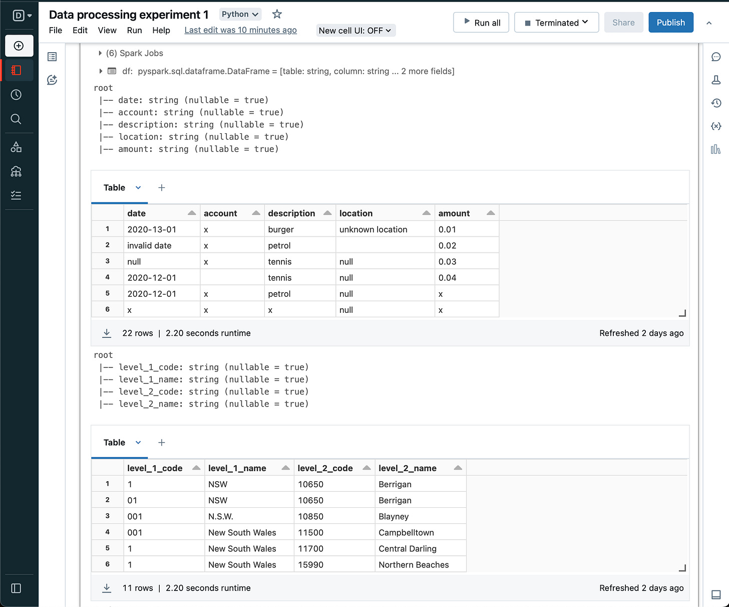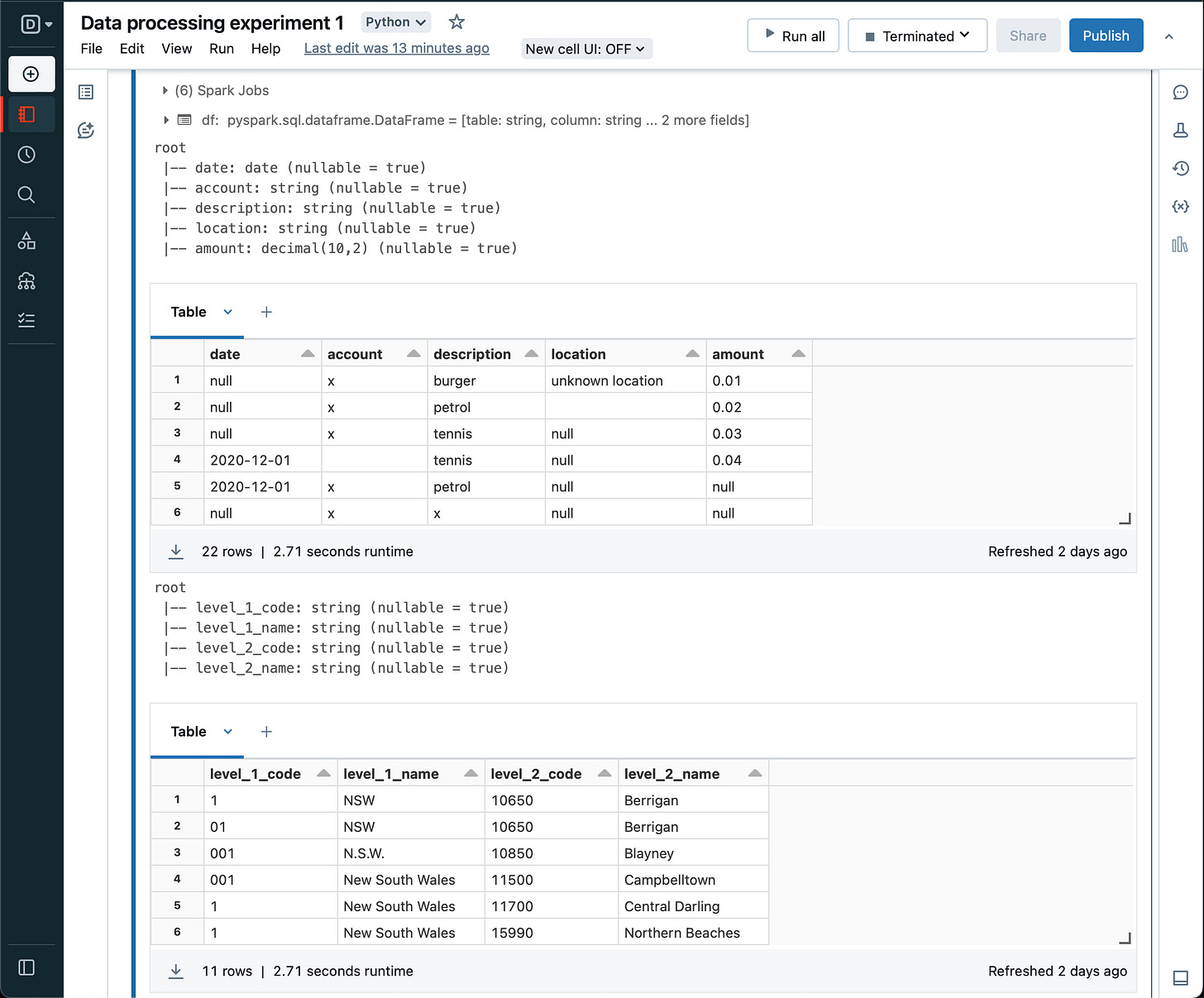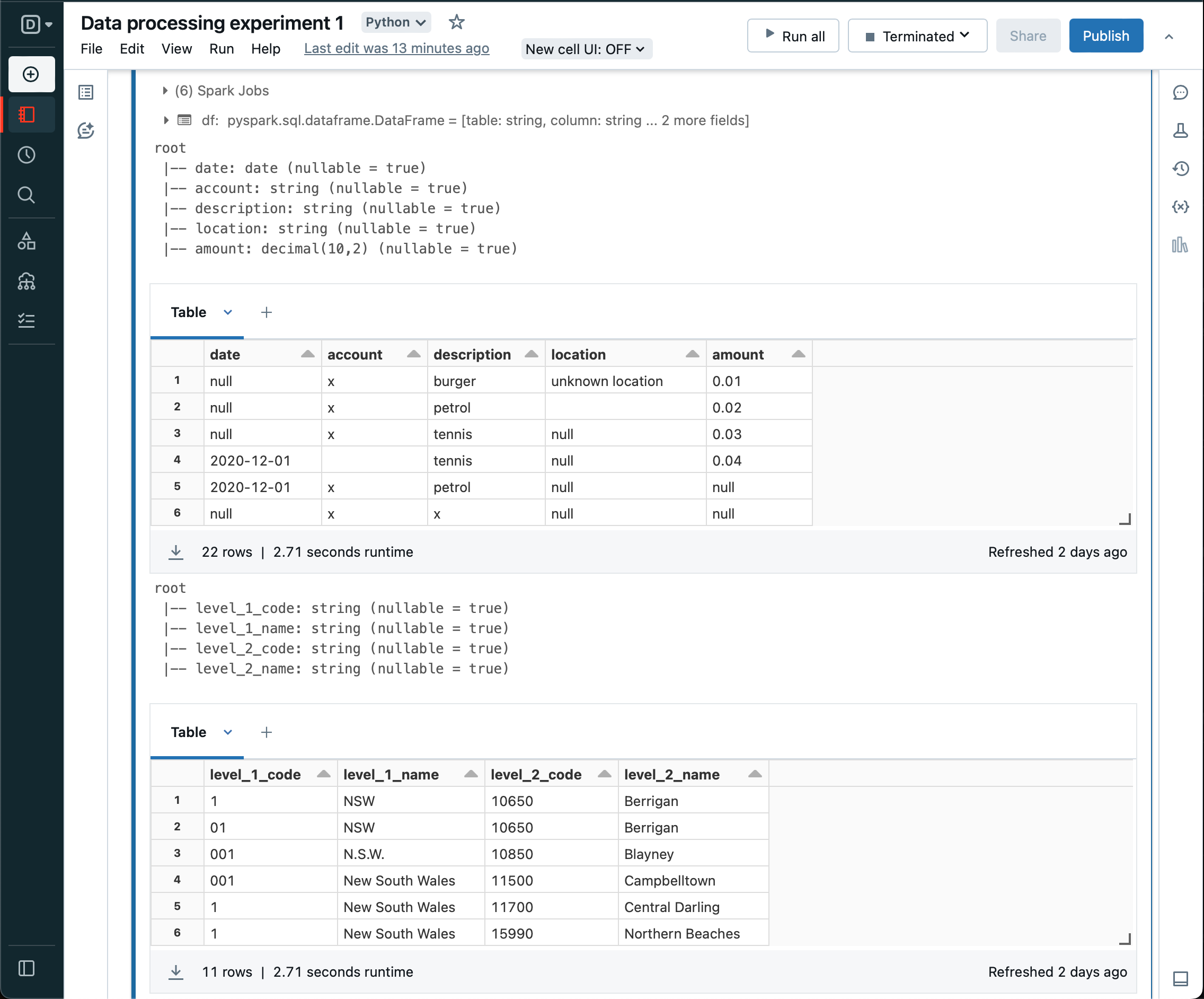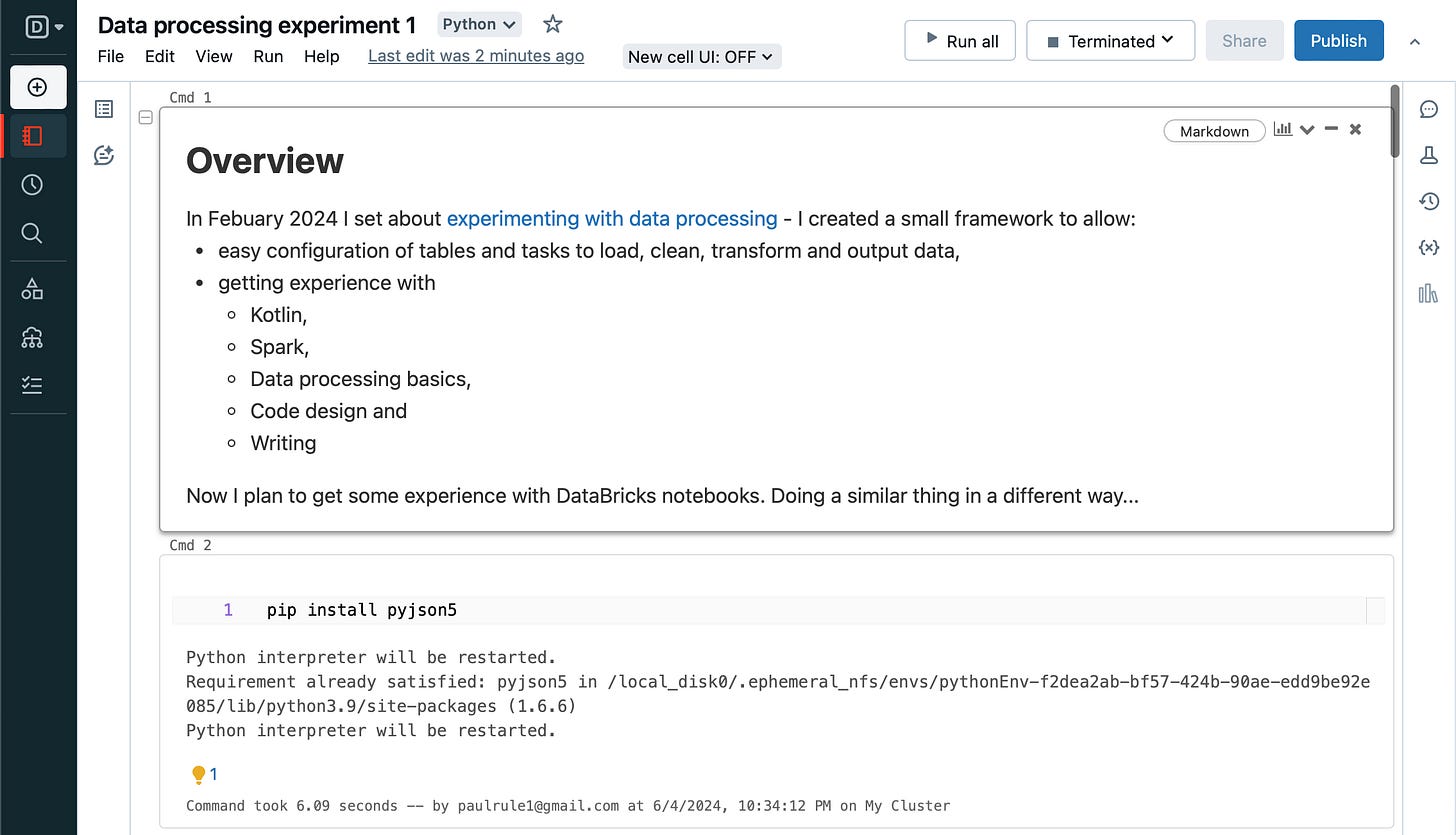 To get started with DataBricks I signed up to the community edition. This has some limitations but it'll suit me for this experiment. I’ve exported the notebook source code to Data processing experiment 1.py.