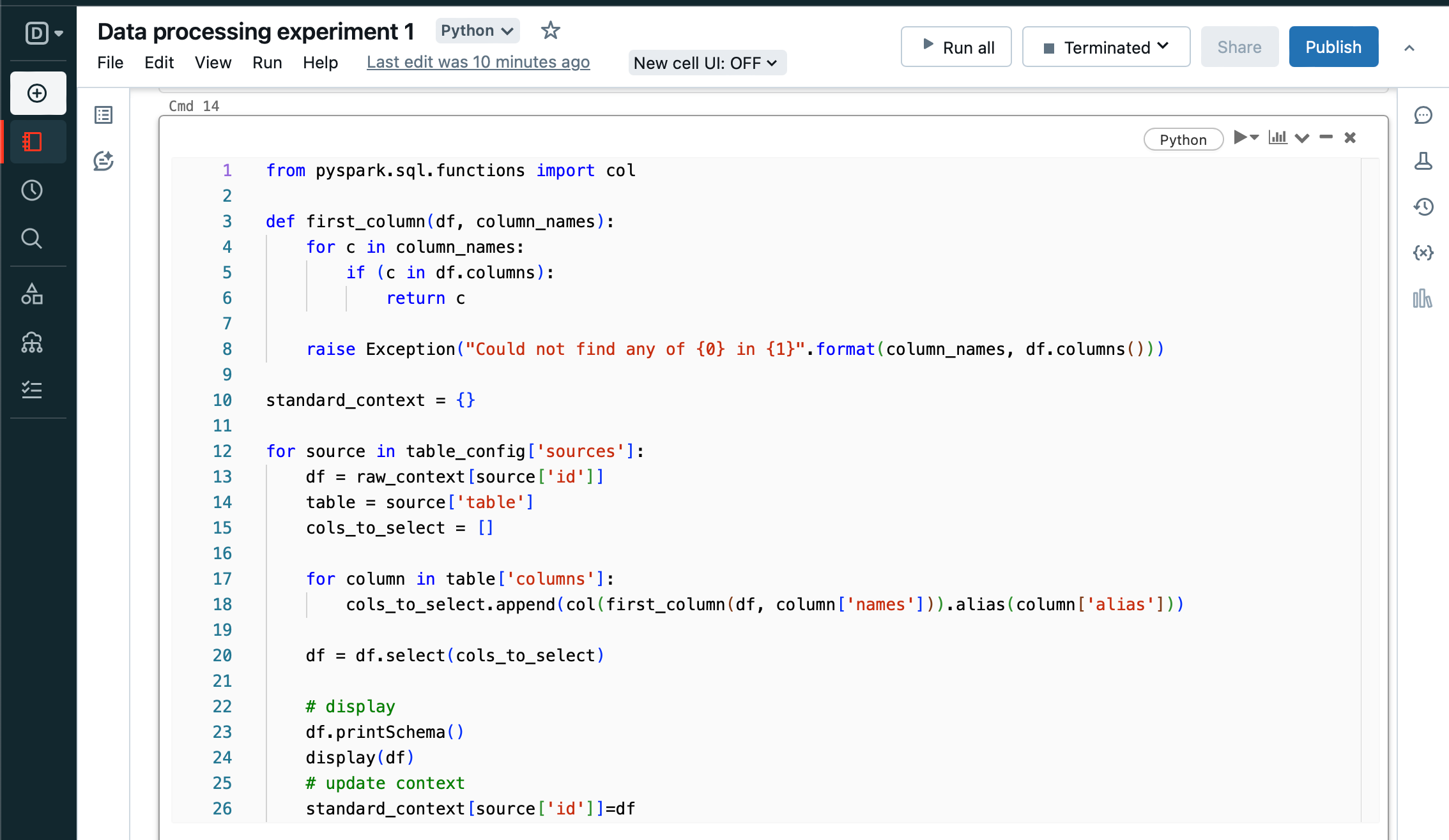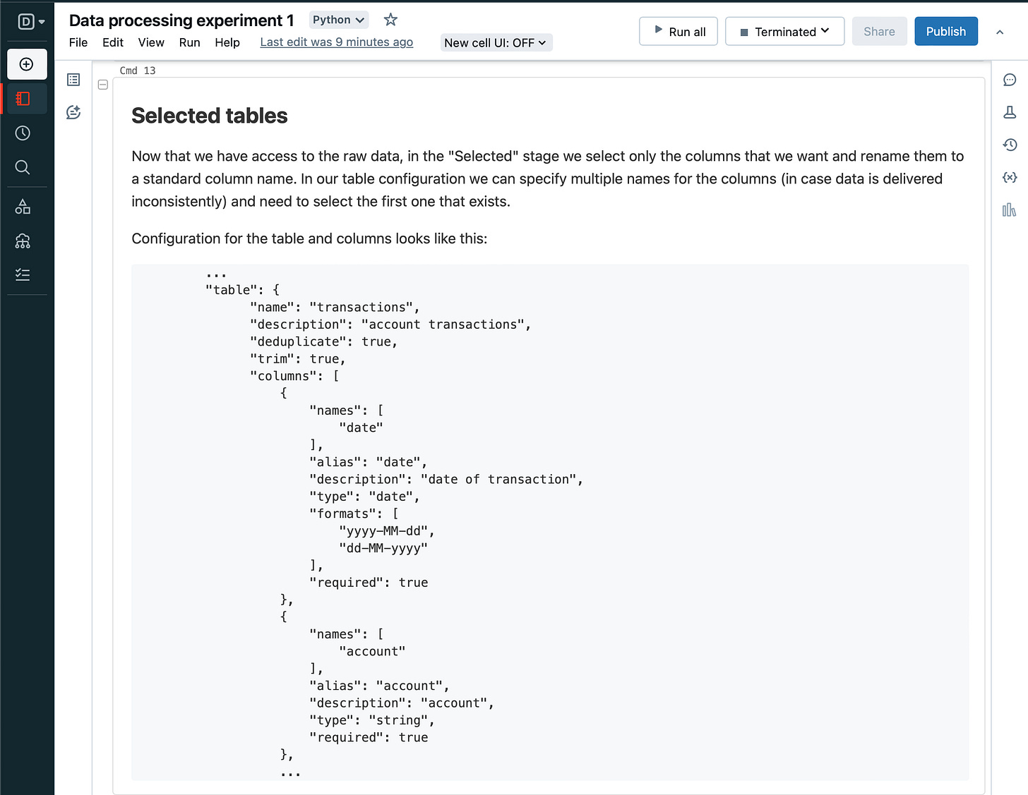 Next, loop over each table in the configuration again, selecting only the defined columns and aliasing so we end up with a standard dataframe.