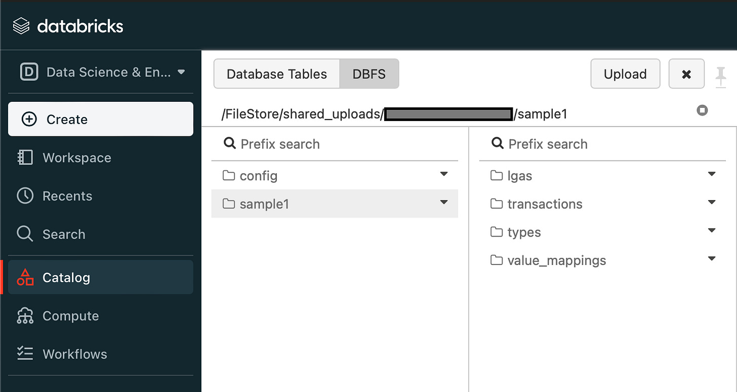 First step is to upload the data I want to use - this is done via the Catalog menu, uploading to DBFS, so we have a directory structure like: