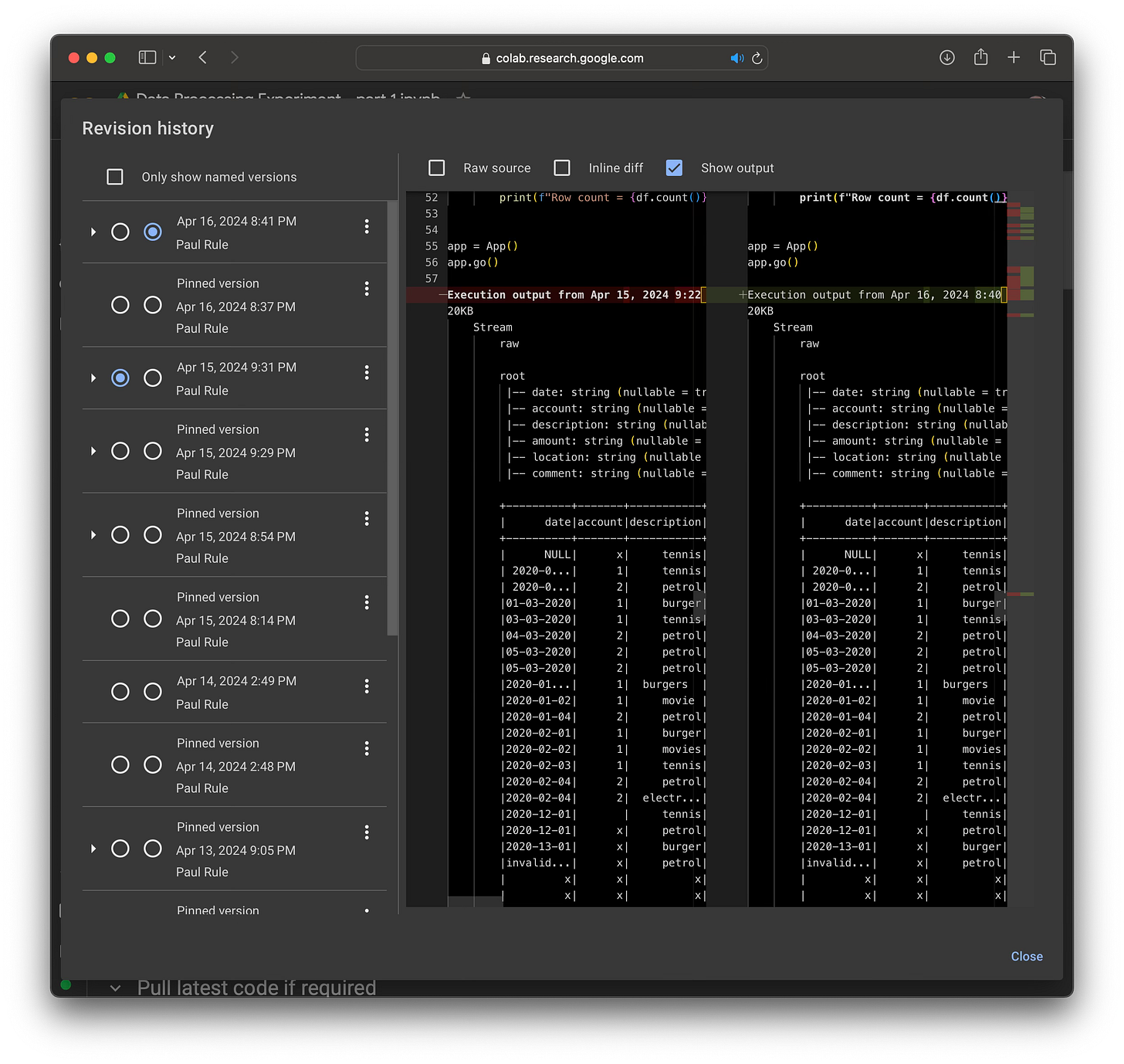 Colab keeps version history, and its easy to browse the history and compare any two versions.