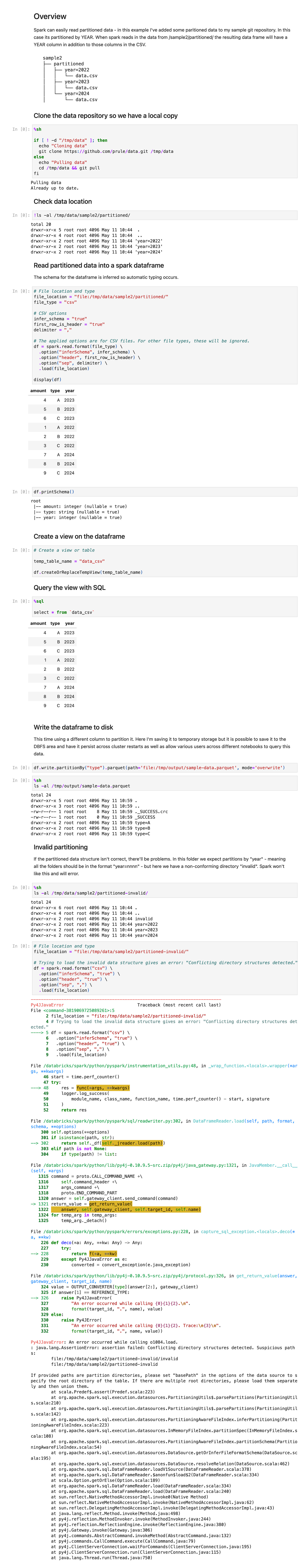 Here I've loaded some partitioned data into a spark dataframe, demonstrated how it can be queried or transformed and then persisted to disk.